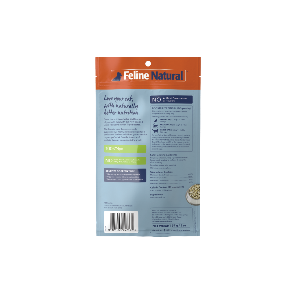Sourcing only the highest quality New Zealand grass-fed, free-range Lamb Green Tripe, Feline Natural Green Tripe Booster aids in healthy digestion, nourishes skin & coat, assists with immune response and improves their overall health & well-being.