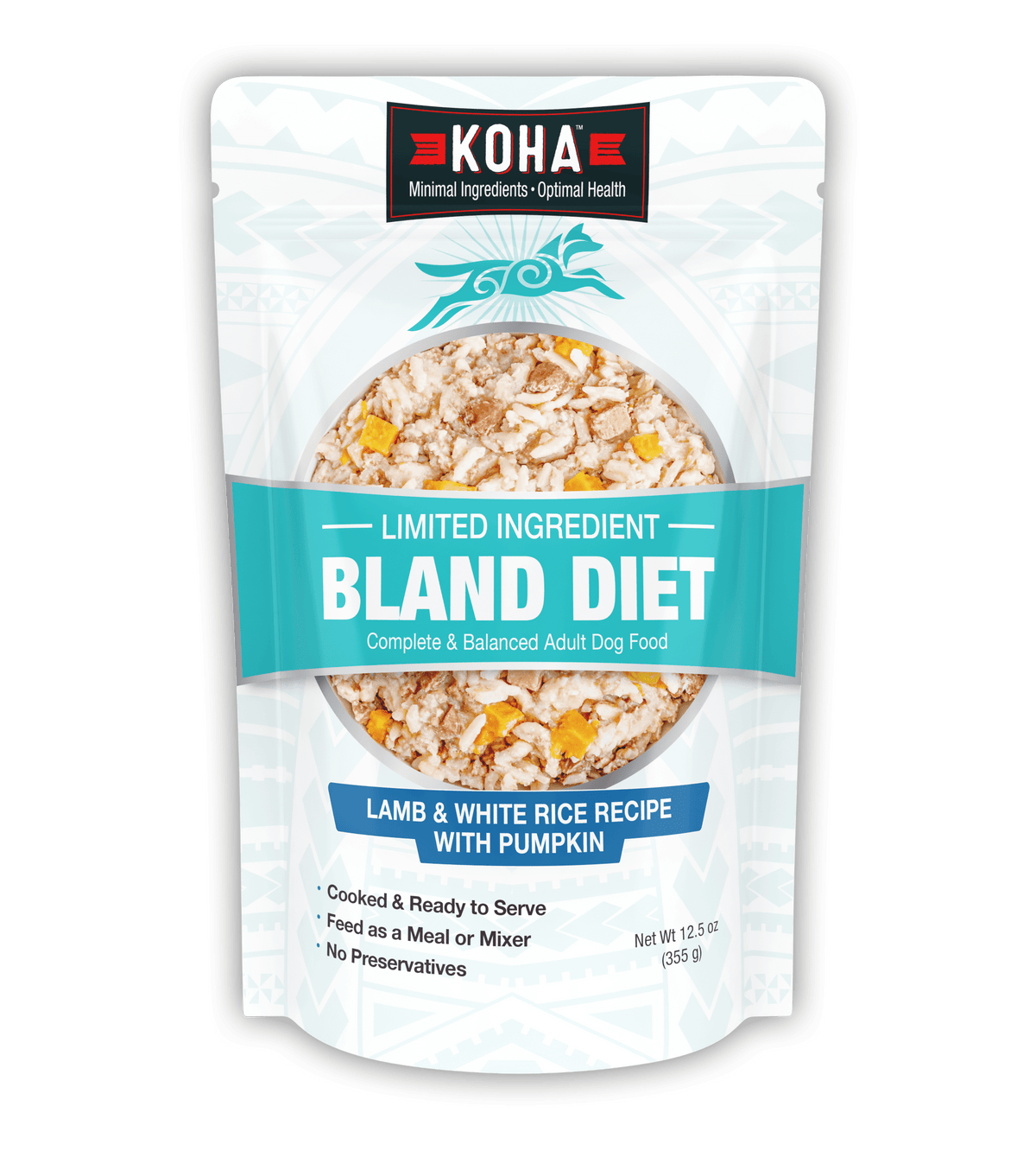 KOHA Bland Diet for dogs is ideal for dogs with upset stomach, loose stool, or diarrhea. This gently formulated limited ingredient dog food recipe has just one protein source for easy digestion. It also includes white rice and pumpkin to support healthy stools and regularity.