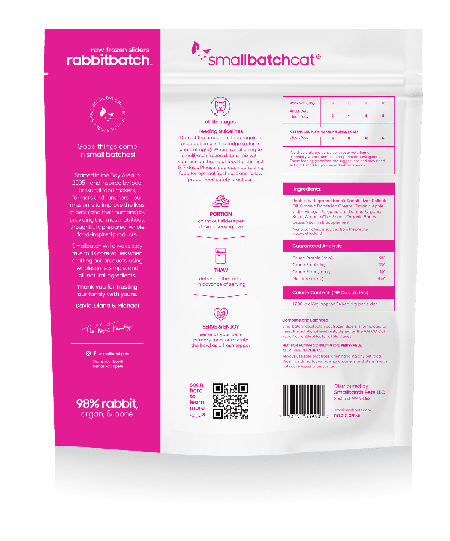 Just who is smallbatch? We are a small, family owned company founded in 2005 in San Francisco, CA. Inspired by the wonderful local and sustainable sources around us, we set out to make a different kind of raw pet food. All of our ingredients are carefully selected to meet the standards we feel every pet deserves: organic herbs and vegetables, hormone and antibiotic free meats, and only pure honest supplements such as organic kelp and bee pollen.