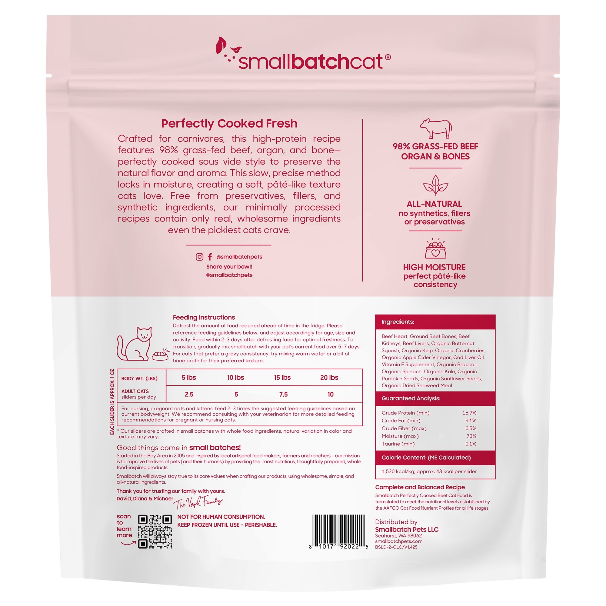 Crafted for carnivores, this high-protein recipe features 98% grass-fed beef, organ, and bone - perfectly cooked sous vide style to preserve the natural flavor and aroma. This slow, precise method locks in moisture, creating a soft, pate-like texture cat love. Free from preservatives, fillers, and synthetic ingredients, Smallbatch Pets' minimally processed recipes contain only real, wholesome ingredients even the pickiest cat crave.