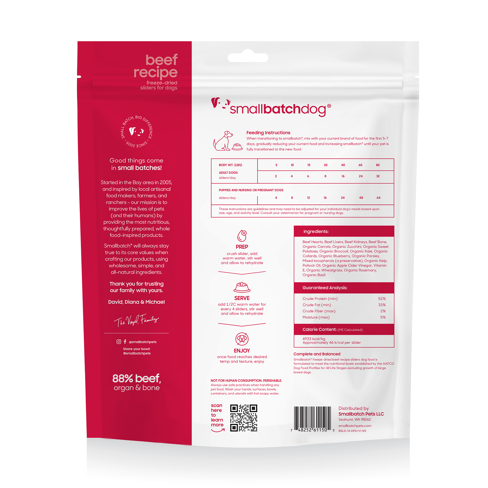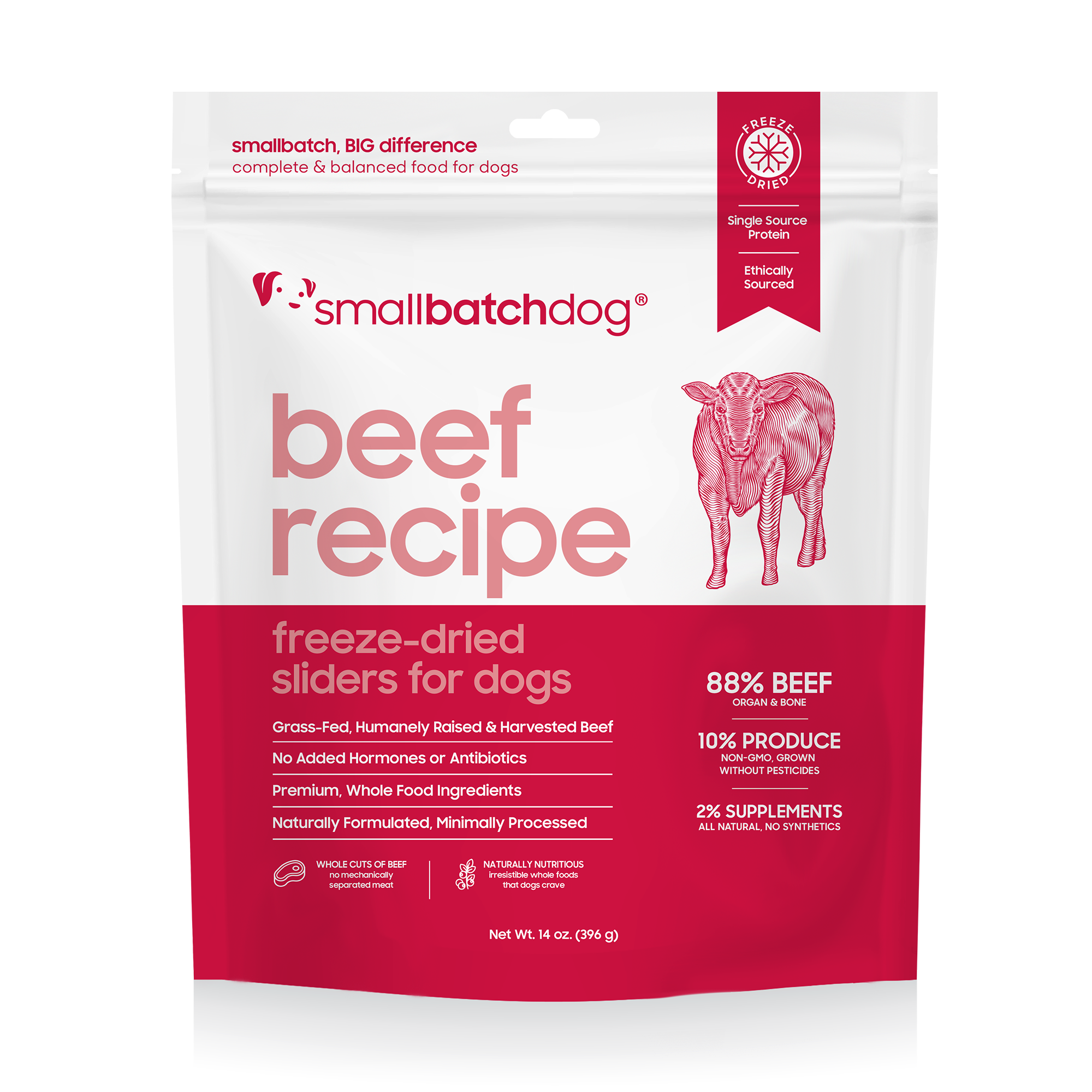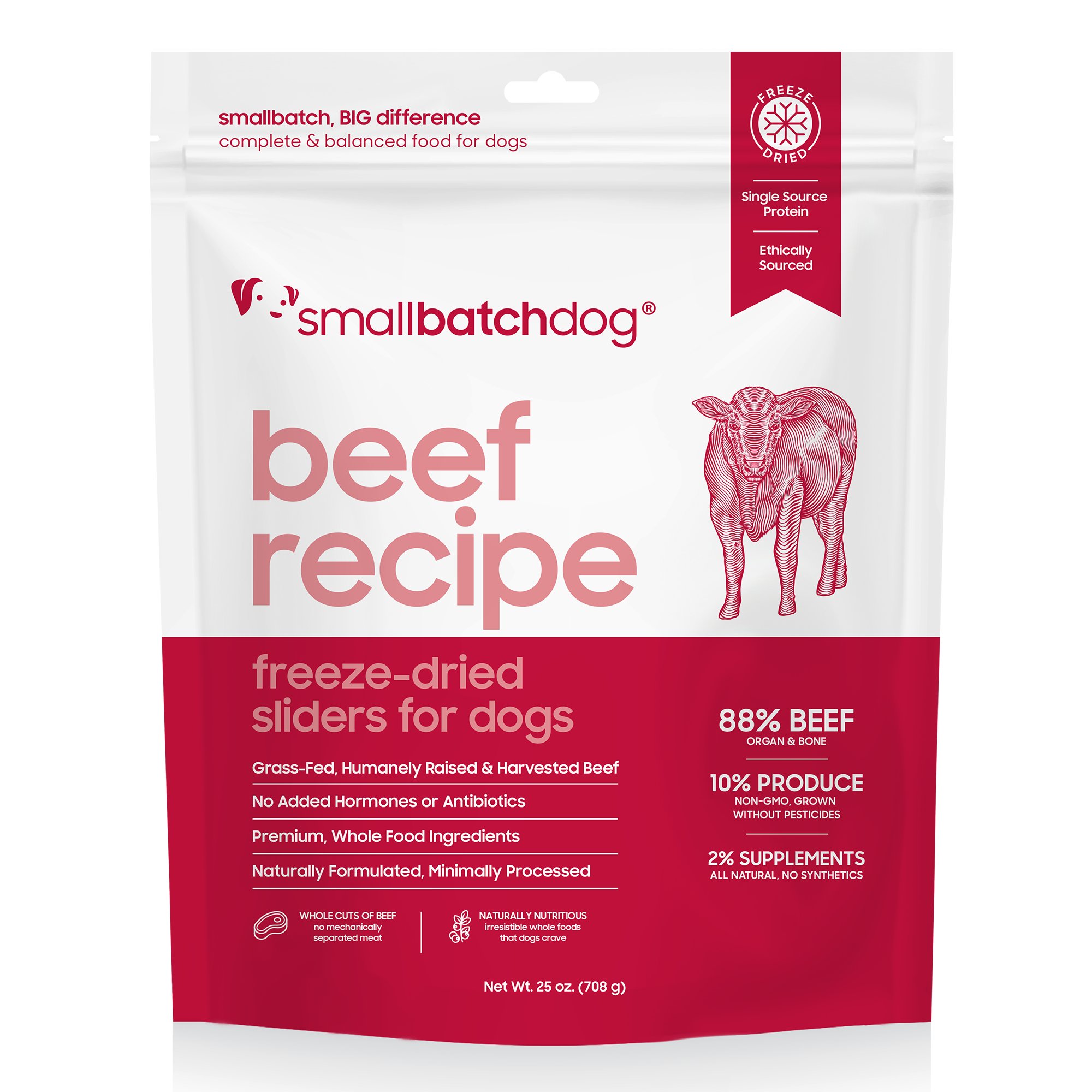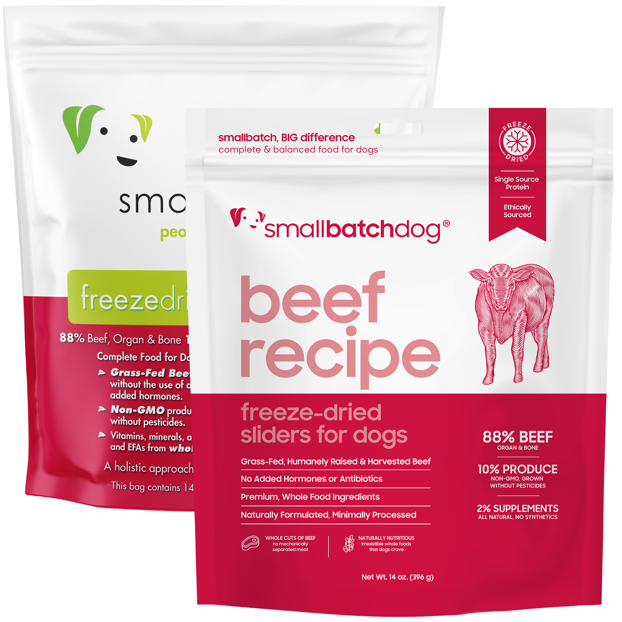 Inspired by our original smallbatch dog frozen formulas, freeze-dried for your convenience. Humanely raised meats with purposeful organic produce. Great for traveling, as a treat, or in addition to other food.