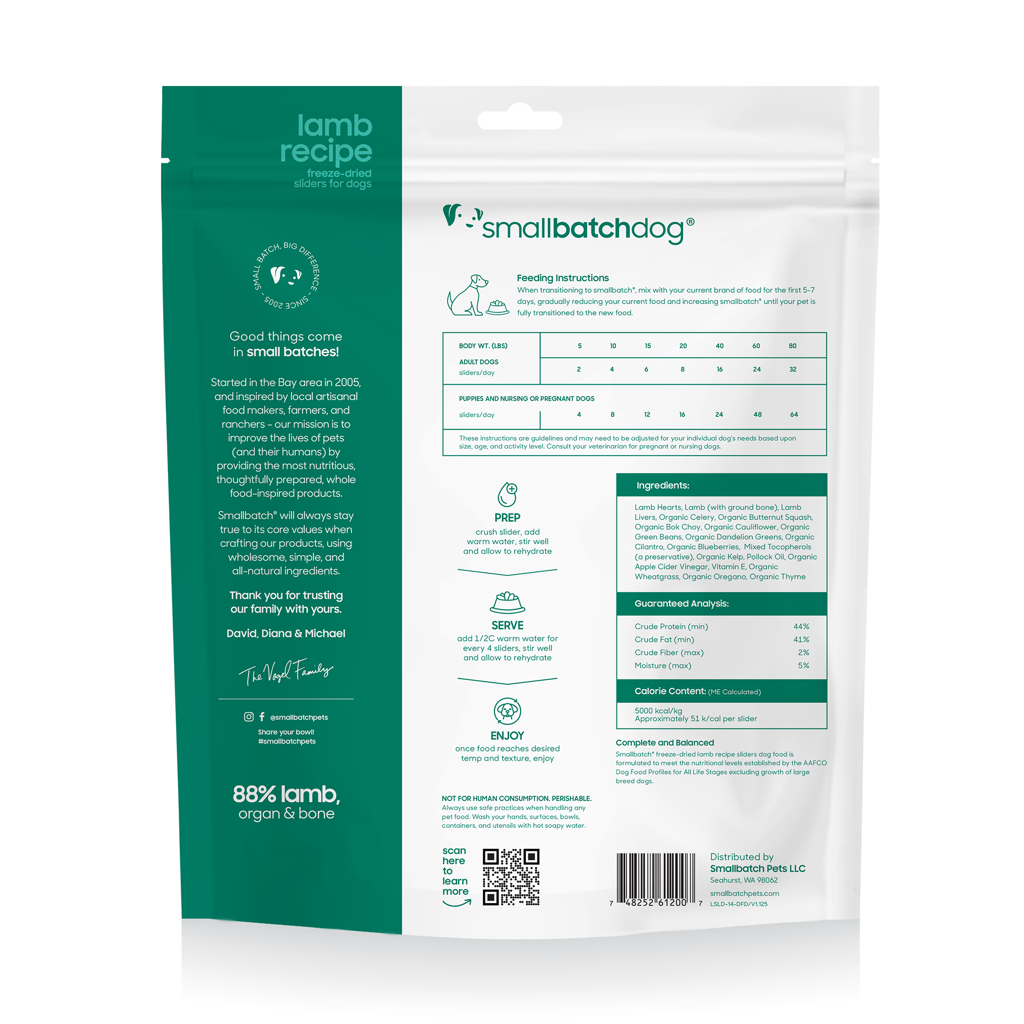 Lamb Hearts, Lamb (with ground bone), Lamb Livers, Organic Celery, Organic Butternut Squash, Organic Bok Choy, Organic Cauliflower, Organic Green Beans, Organic Dandelion Greens, Organic Cilantro, Organic Blueberries, Mixed Tocopherols (a preservative), Organic Kelp, Pollock Oil, Organic Apple Cider Vinegar, Vitamin E, Organic Wheatgrass, Organic Oregano, Organic Thyme